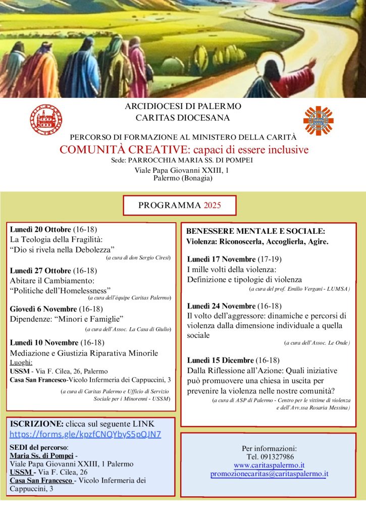 Il percorso si sviluppa in 7 incontri a partire da Lunedì 20 Ottobre 2025, dalle ore 16 alle 18. Tutti gli incontri si svolgeranno quasi tutti presso la Parrocchia Maria Santissima di Pompei, Viale Papa Giovanni XXIII, 1- Palermo (Bonagia). Per maggiori dettagli vedi la locandina.