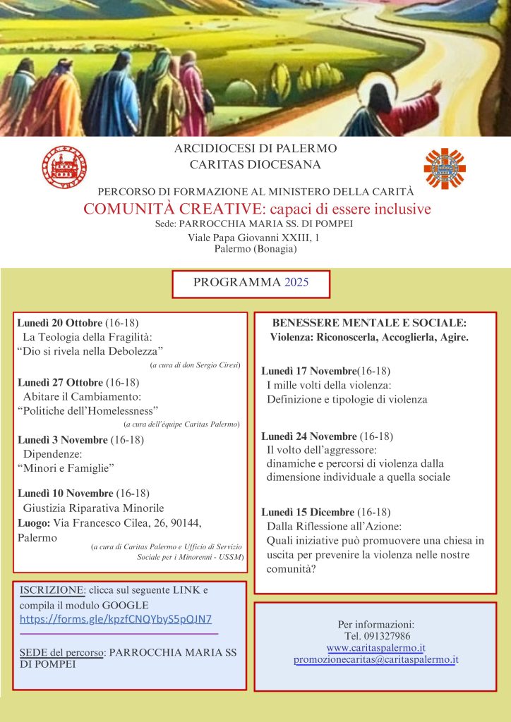 Per ISCRIVERTI al Percorso di Formazione al MINISTERO DELLA CARITA’ – COMUNITA’ CREATIVE, compila il seguente modulo : https://forms.gle/1nFiayy8dSdkCQii8