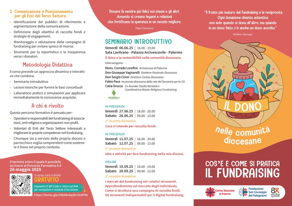 Con tale consapevolezza la Caritas diocesana di Palermo, la Fondazione San Giuseppe dei Falegnami, con l’Ufficio Pastorale, la Rete del Sovvenire per la CEI, il Progetto Policoro e con la collaborazione dello Studio Romboli e Master Religious Fundraising, desideriamo offrire un percorso formativo per acquisire le conoscenze di base e le competenze minime per occuparsi delle donazioni per le proprie realtà. Il desiderio è quello di costituire un modello diocesano di raccolta fondi che valorizzi e supporti le iniziative di solidarietà con una particolare attenzione al Dono, alle Relazioni e alla Creatività.