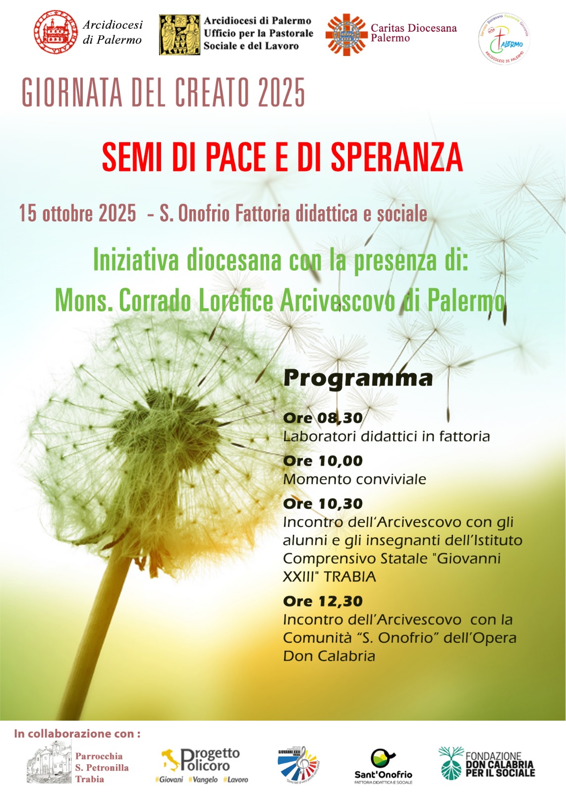 La diocesi di Palermo desidera culminare tale Tempo il 15 Ottobre con la Giornata del Creato iniziativa promossa dagli uffici pastorali per Pastorale Sociale e del Lavoro, Caritas diocesana, Pastorale Giovanile, in collaborazione con la Parrocchia S. Petronilla di Trabia, progetto Policoro, Fattoria didattica e sociale Sant’Onofrio e dall’istituto Comprensivo Giovanni XXIII di Trabia.